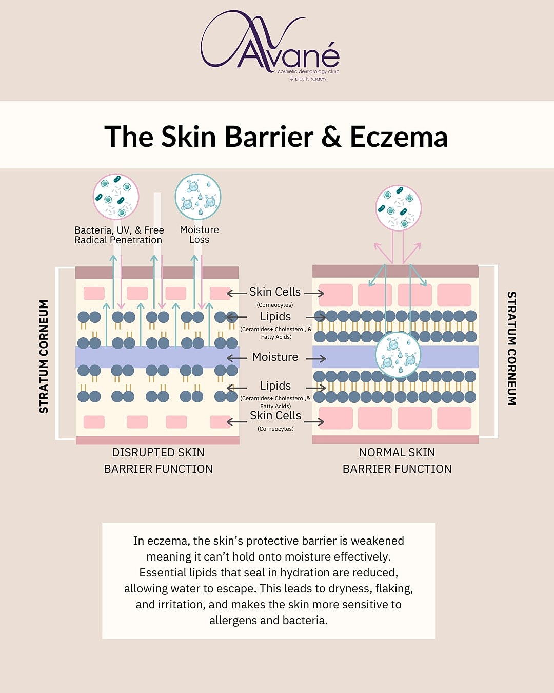 Eczema, also known as dermatitis, affects millions of people and is one of the most common concerns we see at Avané. Triggers can vary from stress and genetics to allergens and weather changes, making eczema as complex as it is frustrating. That’s why our practitioners take time to understand each client’s unique skin before creating a personalized plan that begins with targeted topical care and, when needed, progresses to advanced treatments to restore balance and calm.